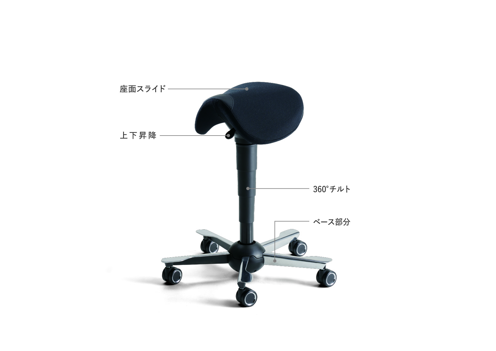 高密度クッションが骨盤を安定させ、乗馬のような姿勢を実現します。後部レバーで座面を前後スライドでき、体格に合わせた軸調整が可能。背もたれに頼らず姿勢を整えるための設計です。